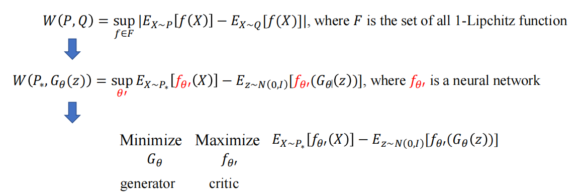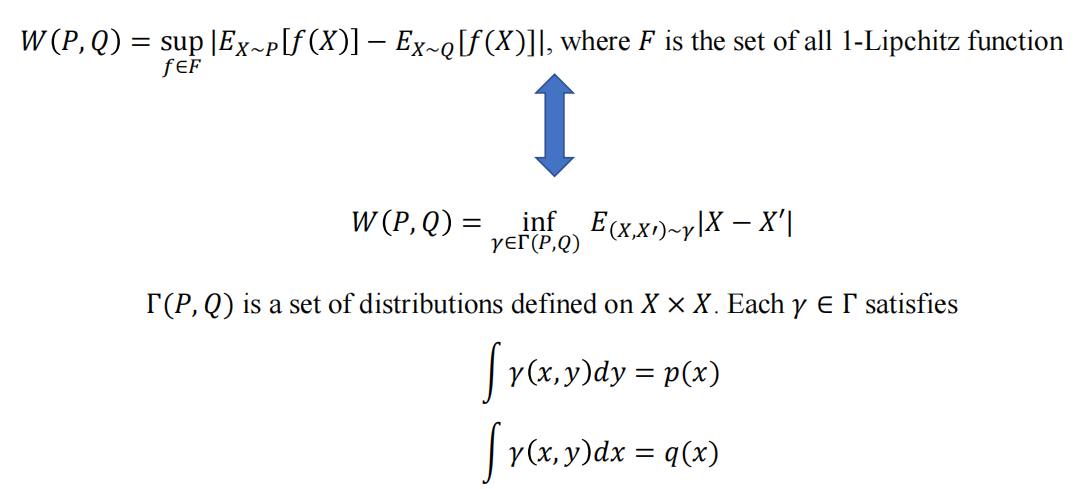 $D_{F}(P,Q)=\sup_{f \in F} |E_{x \sim P}[f(x)]-E_{x \sim Q}[f(x)]|$,此处的$F$为所有1-Lipchitz函数组成的集合,这个距离被称作Wasserstein distance