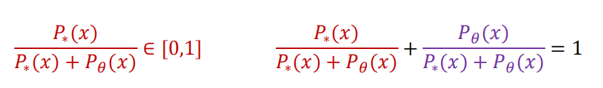 所以如果$\frac{P_{\ast}(x)}{P_{\theta}(x)+P_{\ast}(x)}$趋近于0,那就说明数据$x$几乎没有可能来自于$P_{\ast}$,大概率来自$P_{\theta}$,反之若其趋近于1,则$x$大概率来自$P_{\ast}$