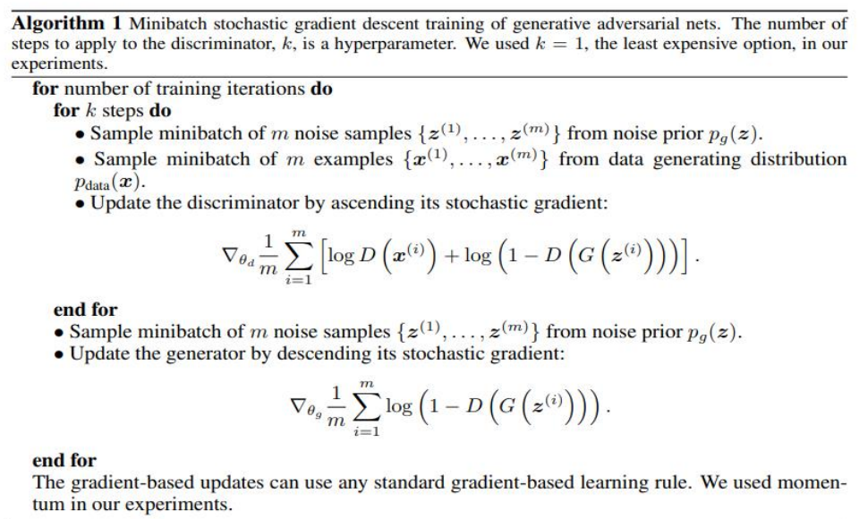 上面即为GAN原始论文的训练方法,先训判别器再训生成器,经典的梯度下降