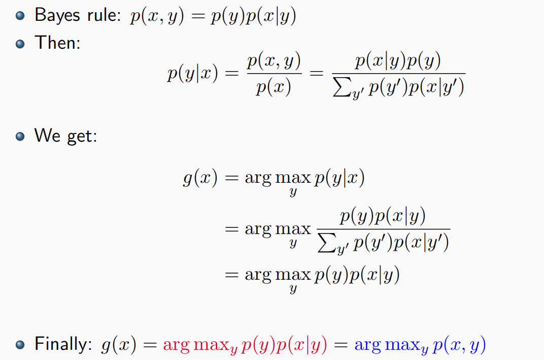 从概率论的角度,$g(x)=argmax_{y} p(y|x)$,所以我们有两种模型