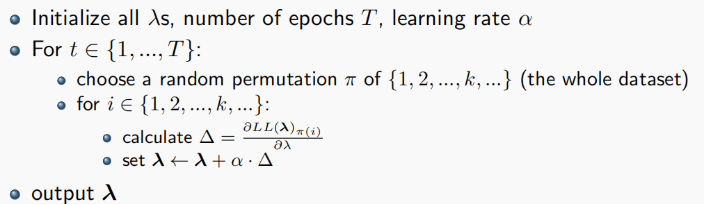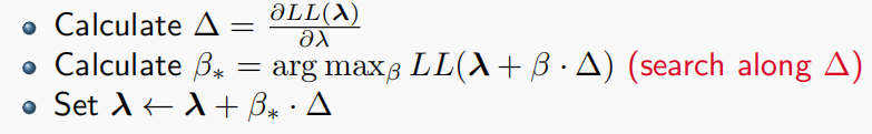 我们采用经典的梯度上升法,初始化所有$\lambda$均为0,然后逐步迭代直至收敛