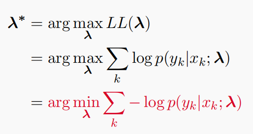 已知训练数据$(x_1,y_1),…,(x_k,y_k)$,那么我们对$\lambda$进行极大似然估计,概率连乘,之后再取对数,即得到$LL(\mathbf{\lambda})$,$L(\lambda)$越大,模型越好