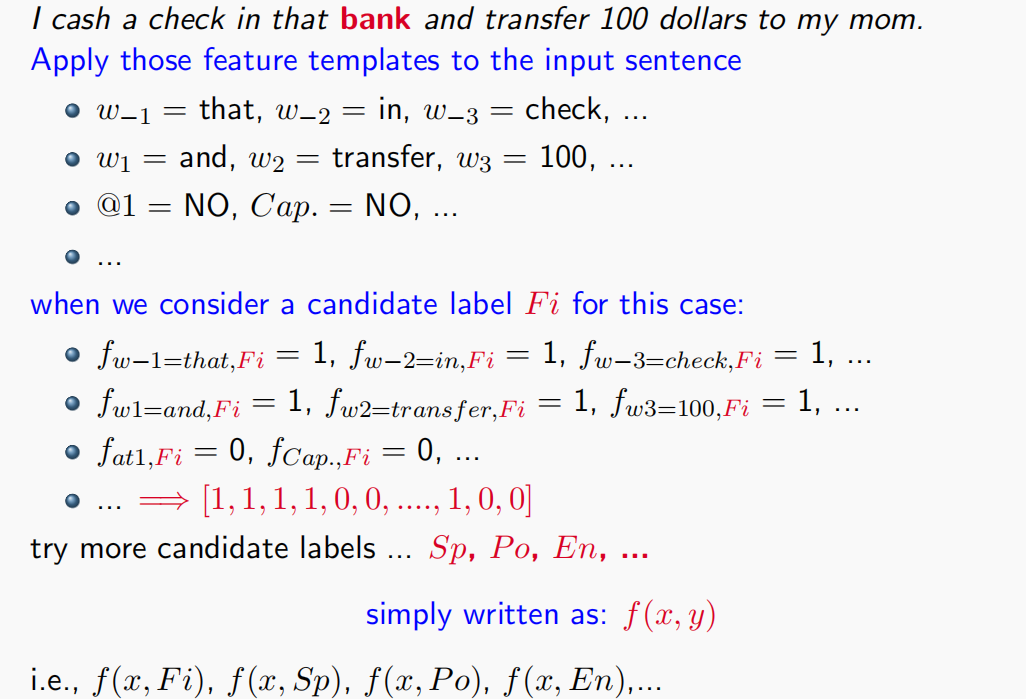 如果要用$m$个维度来描述一个实例,即有$m$个特征,那么每个维度的特征组合起来就成为了一个特征向量$[f_{1}(x,y),…,f_{m}(x,y)]$,比如$[1,0,0,…,1]$