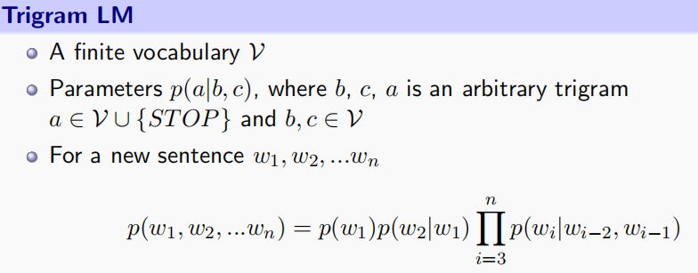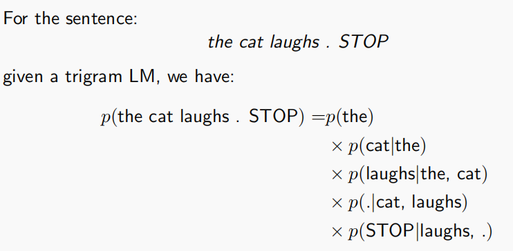 上面就是trigram的定义及例子,注意此处标点符号和终止符STOP也被算作了一个词