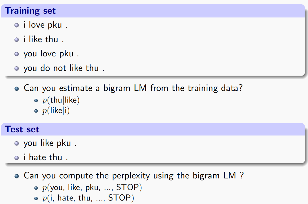 上面是一个例子,测试集中”you like”和”hate”在训练集中都没有,我们只能将其概率设为0,但是这些句子其实是说得通的